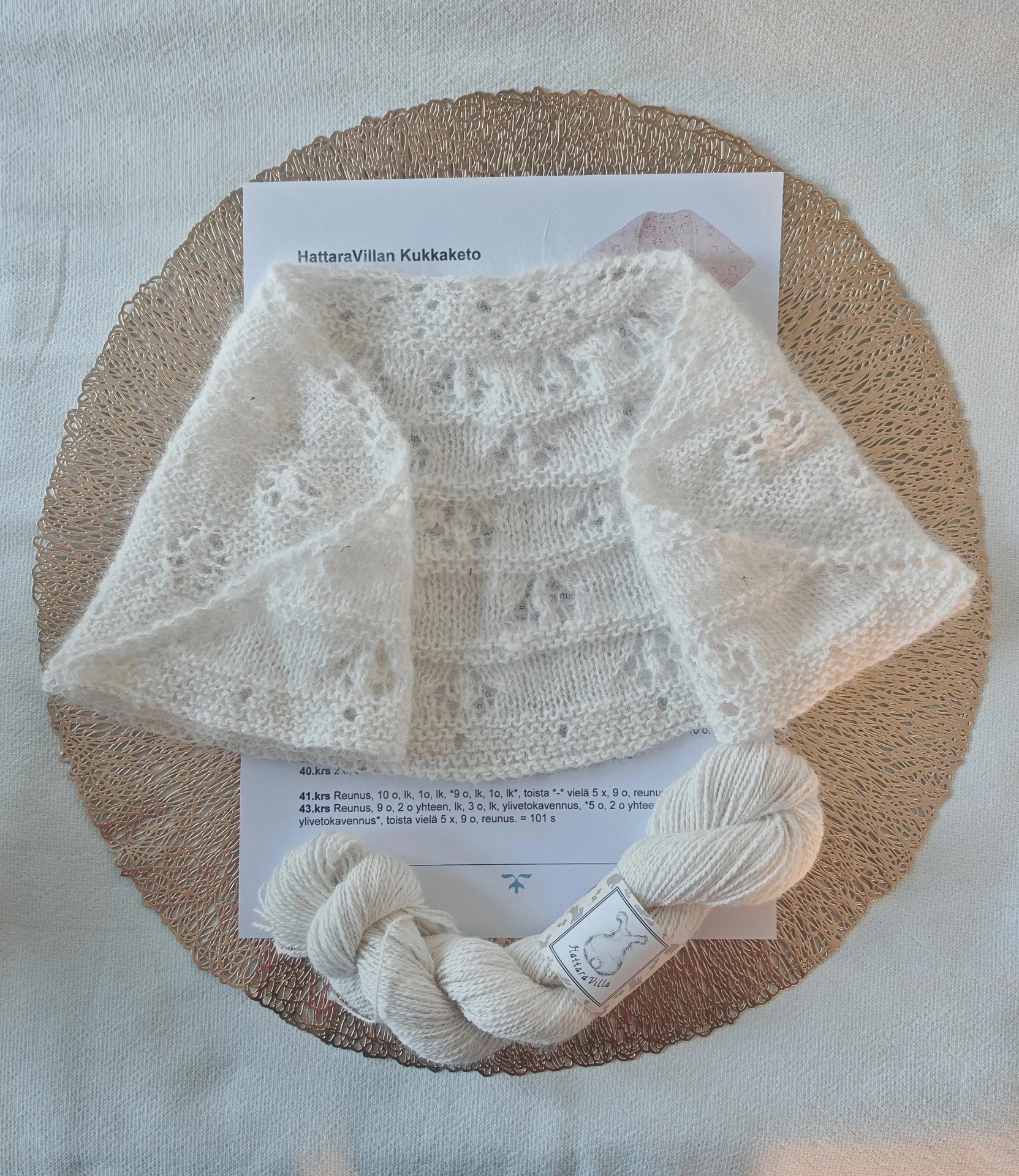 Paketti sisältää yhden vyyhdin 100% angoralankaa ja ohjee ihastuttavaan Kukkaketohuiviin. Ohje on suunniteltu juuri tälle 100% angoralangalle.